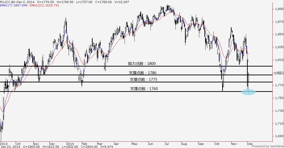 如笔者在大马综合指数期货简析-2 December 2014里所劝告:“接下来投机者们就应要留意最靠近的支撑点数:1760了!如果无法突破这支撑点数:1760的话,HOLD SHORT的投机者们就该平仓了呗!”